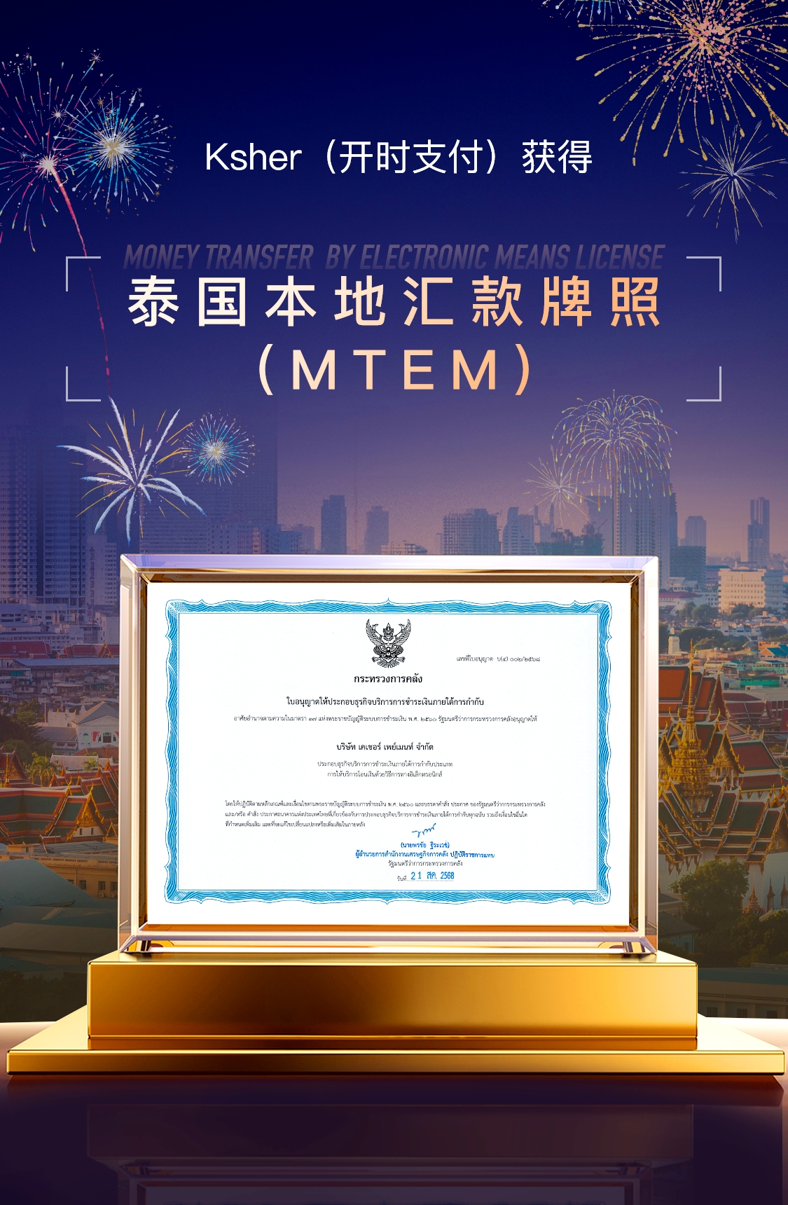 开时支付(Ksher)正式获批泰国财政部颁发的本地汇款牌照(Money Transfer by Electronic Means License(以下简称MTEM)),在东南亚支付服务再增加一枚宝贵牌照,成为极少数东南亚市场牌照覆盖最全的专业支付机构之一。