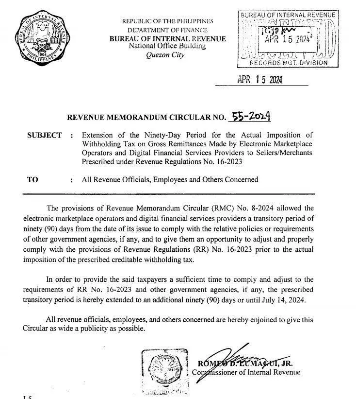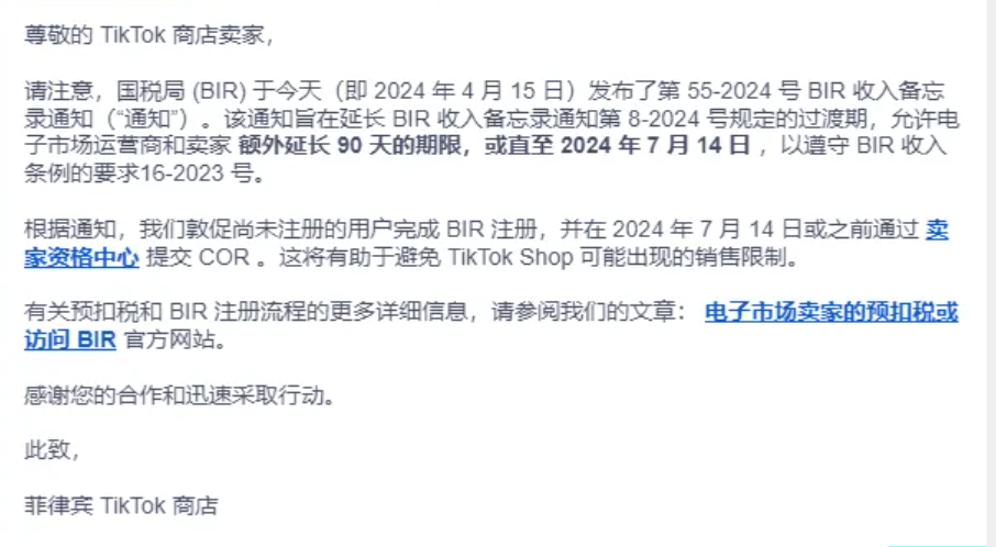 2024年4月15日,菲律宾国税局(BIR)发布了新的第55-2024号收入备忘录(以下简称“该备忘录”)通知,税务法规遵守时限将延长至2024年7月14日,在此日期之前所有菲律宾本土电商卖家都需要在卖家中心上传税务信息(BIR注册证书/COR-2303),以确保适当的税收和遵守新法规。否则,买家或将无法看到店铺内的商品,导致店铺无法收到新订单。