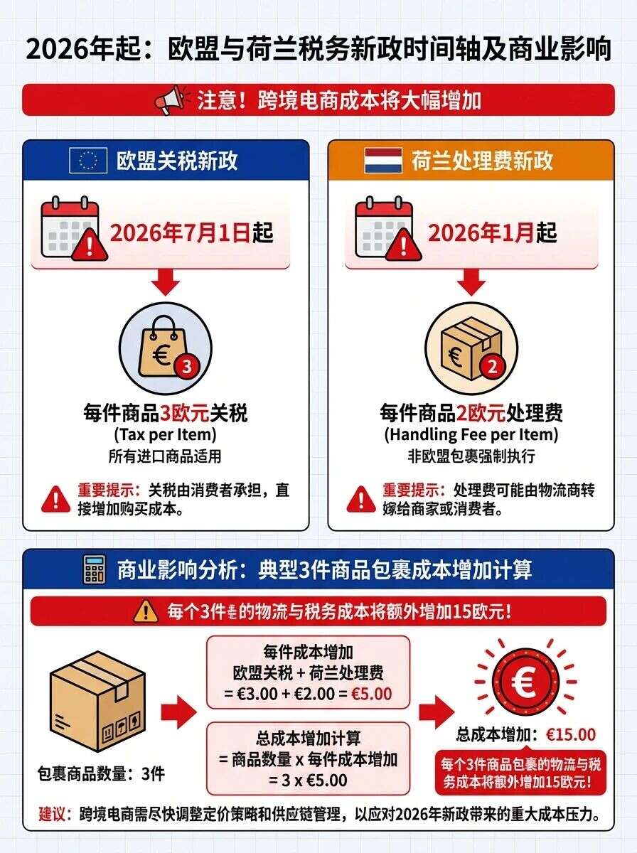 欧盟27个成员国财政部长于2025年12月12日达成一致,决定自2026年7月1日起,对单件价值低于150欧元的跨境电商包裹征收每种商品3欧元的关税。这一过渡政策将实施至欧盟正式取消低价值包裹免税政策并建立新的长期关税制度。与此同时,荷兰计划自2026年1月开始,对从欧盟以外地区进口、价值不超过150欧元的小额免税电商包裹每件商品征收2欧元的处理费。该费用按"产品条目"计算,而非包裹件数,预计进入荷兰的跨境小额包裹平均每个包含三种不同产品,消费者平均将多支付6欧元。