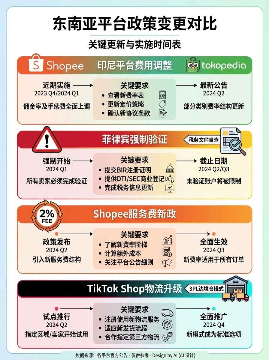 东南亚主要电商平台近期密集调整运营政策。印尼电商协会(idEA)正与贸易部、中小微企业部讨论Shopee、Tokopedia等平台费用上涨机制,确保不会给小企业带来过大压力。Shopee菲律宾在双12前夜发布强制验证要求,卖家需尽快自查后台税务文件。同时,Shopee宣布从下月起对特定订单收取2%服务费。马来西亚则取消了电子发票强制要求,为卖家提供一定缓冲空间。TikTok Shop推出3PL边境仓模式,升级东南亚物流服务,Shopee也同步上线即时配送新物流服务。