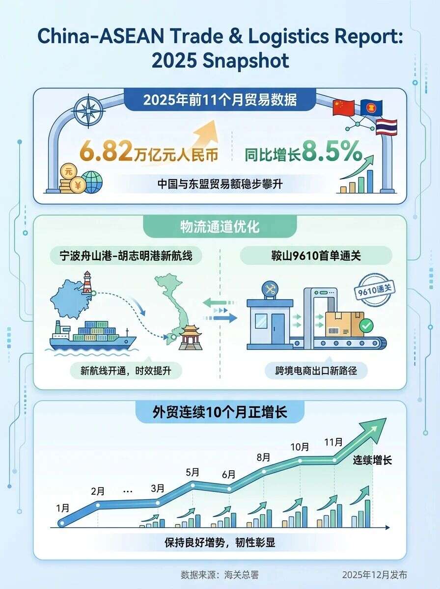 海关数据显示,2025年前11个月,东盟继续保持中国第一大贸易伙伴地位,双边贸易总值达6.82万亿元人民币,同比增长8.5%,占中国外贸总值的16.6%。中国外贸连续10个月保持正增长,前11个月进出口总值41.21万亿元,同比增长3.6%。在物流通道方面,宁波舟山港于2025年12月12日开通至越南胡志明港的新集装箱直航线路,提升运输时效、降低物流成本。中国(鞍山)跨境电商综试区完成首单"9610"模式出口通关,标志着鞍山正式打通跨境电商B2C零售出口通道。