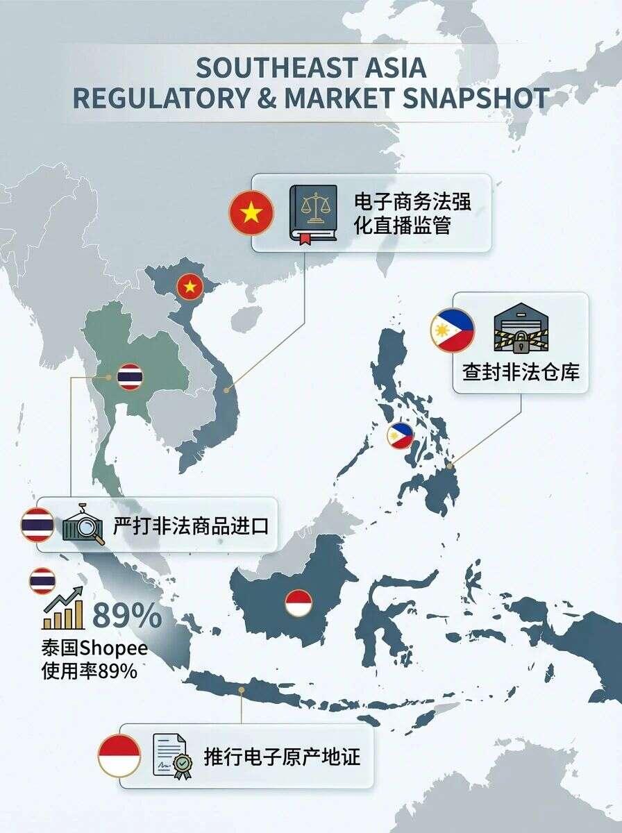 东南亚各国持续完善电商监管体系。越南近期通过《电子商务法》,强化对直播电商的监管力度,同时面临虚拟折扣泛滥问题。泰国采取多措施严打非法商品进口,加强海关查验与市场监督。印尼推行电子原产地证制度,提升贸易透明度。菲律宾海关查封一涉华非法仓库,显示执法力度加强。在市场表现方面,泰国电商竞争加剧,Shopee占据89%使用率,新加坡消费者提前启动年末购物,显示东南亚电商市场持续活跃。