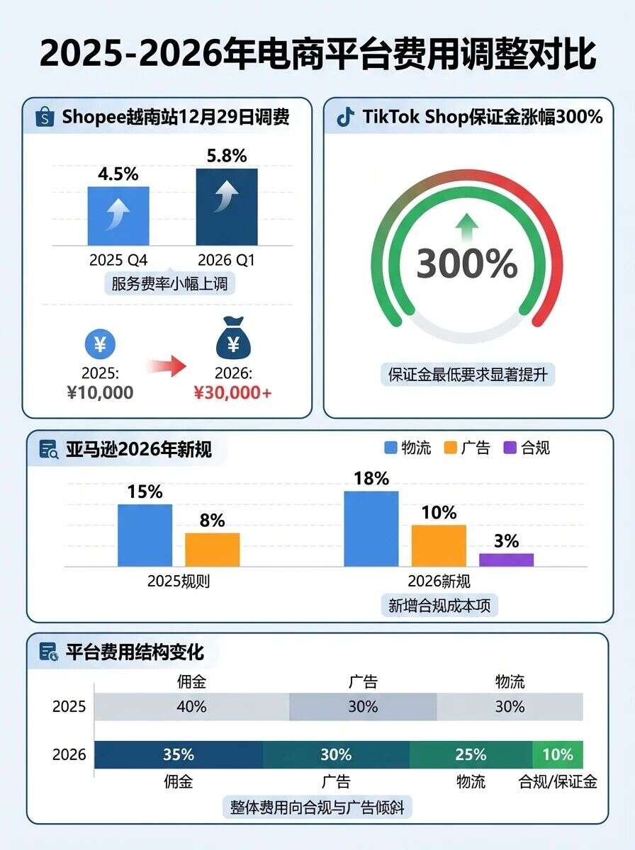 Shopee越南站宣布自2025年12月29日起调整多项费用政策,包括更新额外优惠券套餐服务费、促销代码联合赞助分成比例。TikTok Shop在东南亚发布新规,明确禁止未经清晰标识的推广性直播与内容。亚马逊发布2026年新规,卖家需提前准备以确保合规销售。同时,TikTok Shop、Temu等平台相继上调多项类目卖家保证金,部分品类涨幅高达300%,服饰、美妆等高风险类目首当其冲。