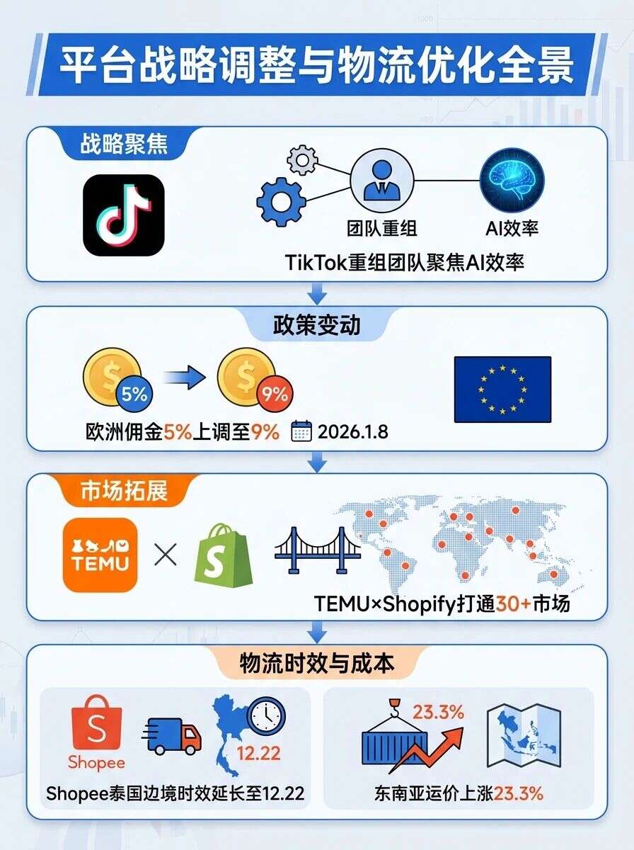 TikTok近期重组电商产品与数据团队,将AI与效率提升作为投资重点,并在欧洲市场推出新功能。同时,TikTok Shop欧洲五国站点销售佣金将从5%上调至9%(2026年1月8日生效)。TEMU与Shopify打通,为约225万Shopify商家提供进入全球30多个市场的通道。物流方面,泰柬边境冲突导致陆运中断,Shopee已延长泰国受影响地区订单发货时效至12月22日,东南亚航线运价指数较一个月前大幅上涨23.3%。