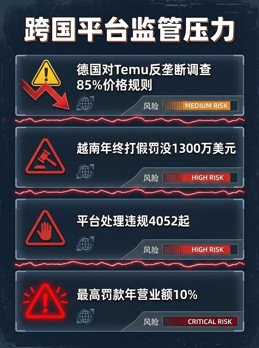 德国联邦卡特尔局已正式对Temu德国母公司Whaleco Technology Limited启动反垄断调查,核心审查其是否通过卖家合作条款不当限制定价自由,特别是涉嫌设定"85%价格规则"。若被认定违反卡特尔禁令,Temu可能面临最高年营业额10%的罚款。同时,越南政府加强年末打假执法力度,仅在11月河内市就查处2447起违规案件,罚没金额达1300万美元。电商平台日益成为假货流通重要渠道,今年前九个月数字平台已累计处理4052起违规行为。