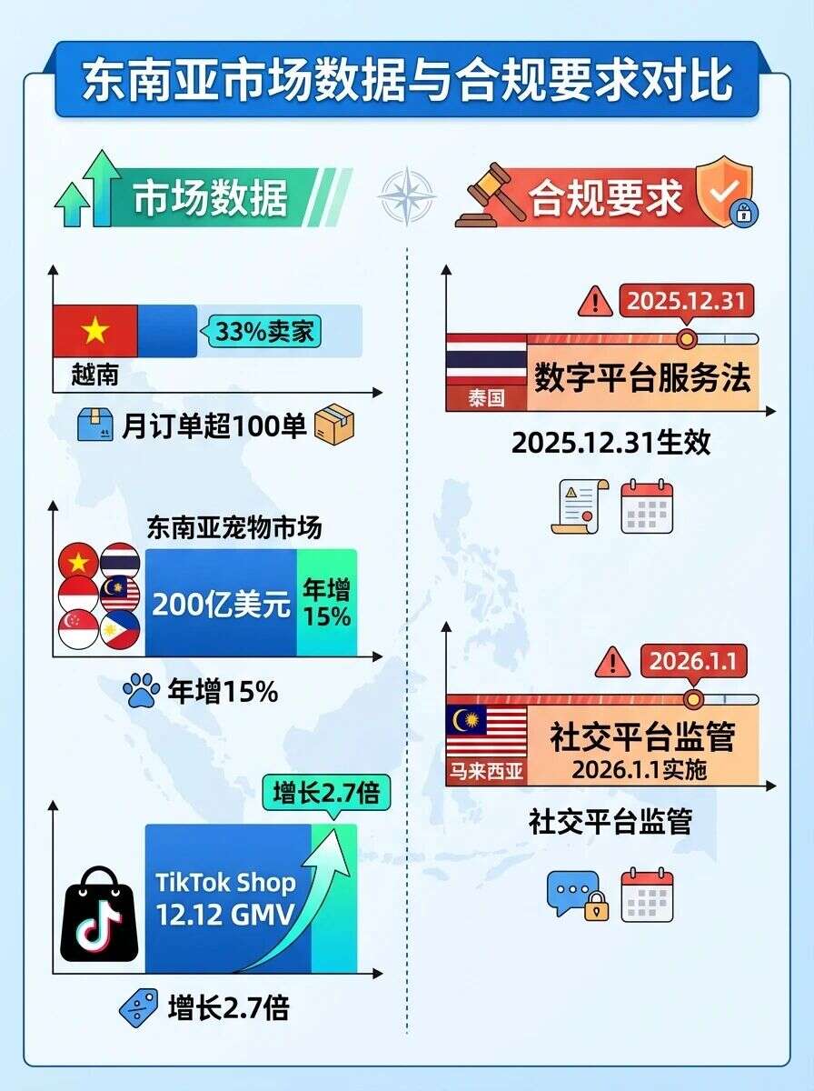 东南亚电商市场呈现强劲增长态势,TikTok Shop东南亚12.12大促全域GMV同比激增2.7倍。越南卖家表现突出,约33%的卖家月订单量超过100单,高于东南亚22%的平均水平。东南亚宠物跨境市场规模已突破200亿美元,年增速超15%。与此同时,合规要求全面升级:泰国《数字平台服务法》将于2025年12月31日生效,要求保健品、化妆品和电器商家展示FDA及TISI许可证;马来西亚宣布从2026年1月1日起,将用户数超过800万的大型社交平台纳入法律监管。