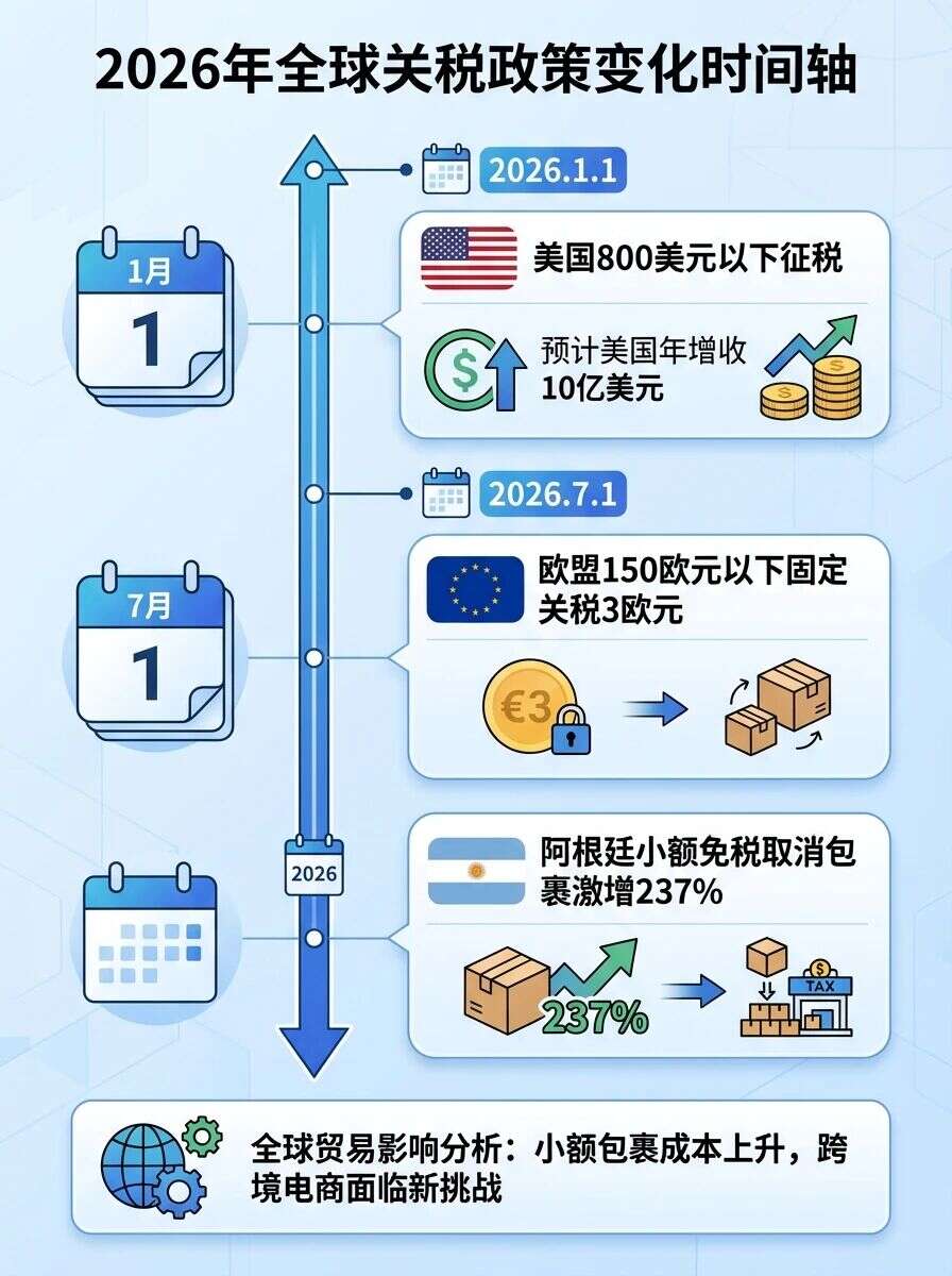 美国国会预算办公室最新报告显示,取消800美元以下进口商品免税政策将于2026年1月1日正式实施,预计每年为美国财政增收约10亿美元。2023年此类免税进口包裹数量高达10亿件,主要来自中国电商平台。欧盟方面,理事会宣布自2026年7月1日起,对货值低于150欧元的包裹征收3欧元固定关税。阿根廷取消小额进口关税已导致中国包裹激增237%。这些政策调整将直接增加跨境小包商品的进口成本,最终可能转嫁给消费者。