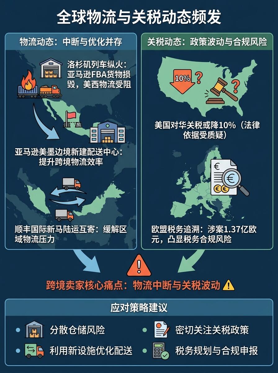 简评:物流中断与关税波动仍是跨境卖家的核心痛点。建议卖家分散仓储风险,利用新建物流设施优化配送,同时密切关注关税政策,做好税务规划与合规申报。⚠️