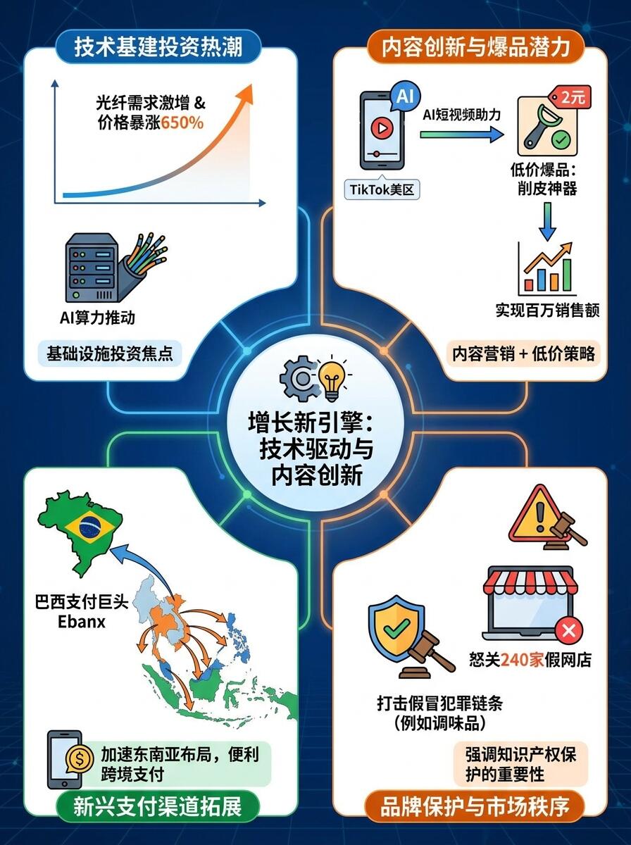 简评:技术驱动与内容创新成为增长新引擎。卖家可借助AI工具优化营销,关注新兴支付渠道,同时加强品牌保护,打击假冒产品,维护市场秩序。💡