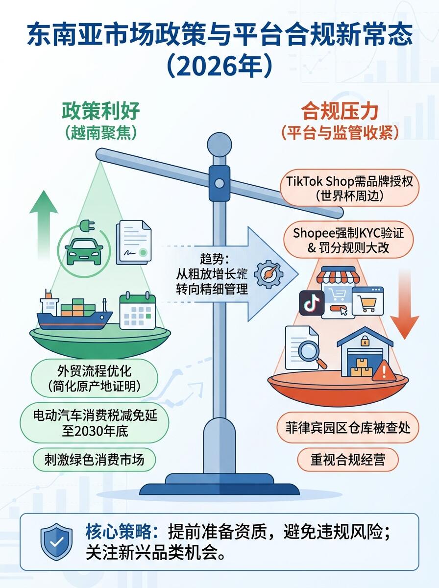 简评:东南亚市场正从粗放增长转向精细管理,政策利好与合规压力并存。卖家需提前准备资质文件,避免因违规导致店铺受限,同时可关注越南电动汽车等新兴品类机会。🚀