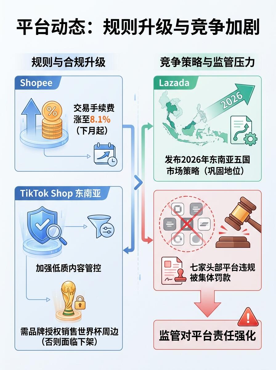 Shopee宣布从下月起交易手续费涨至8.1%,TikTok Shop东南亚则加强低质内容管控,并规定销售世界杯周边需品牌授权,否则可能面临下架。Lazada也发布了2026年东南亚五国市场策略,旨在巩固市场地位。此外,七家头部平台因违规被集体罚款,显示出监管对平台责任的强化。