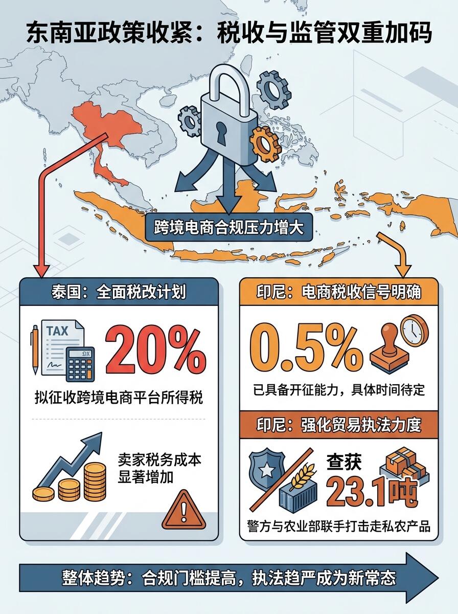 近期,东南亚跨境电商市场迎来密集的政策调整与平台规则更新,从泰国拟对跨境电商企业征收20%所得税,到印尼警方联手农业部打击粮食走私网络,再到Shopee、TikTok Shop等平台纷纷调整手续费与内容管控措施,整个区域市场正加速向合规化、精细化方向演进。