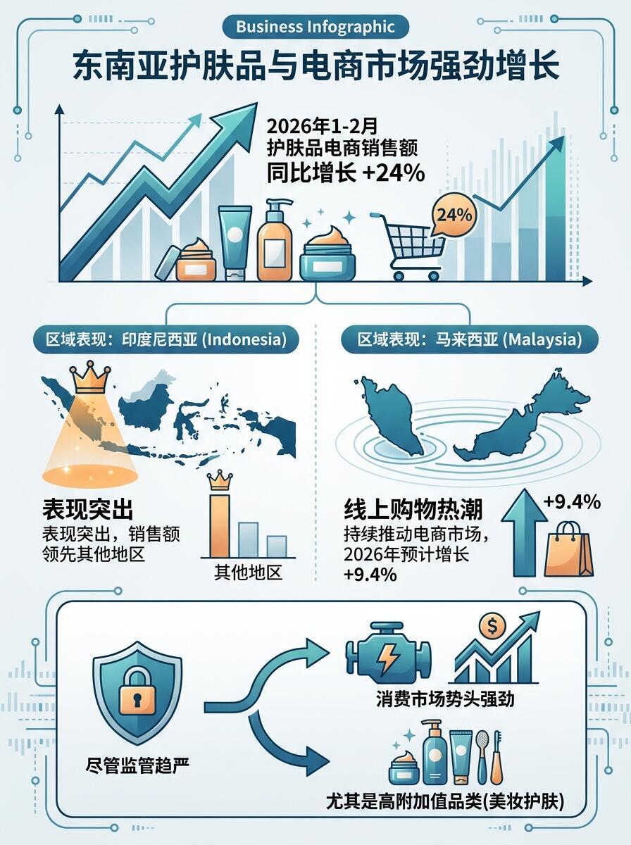 2026年1-2月,东南亚护肤品电商销售额同比增长24%,其中印尼市场表现尤为突出,销售额领先其他地区。线上购物热潮持续推动马来西亚电商市场,预计2026年将增长9.4%。这些数据表明,尽管监管趋严,但东南亚消费市场依然保持强劲增长势头,尤其是美妆护肤等高附加值品类。