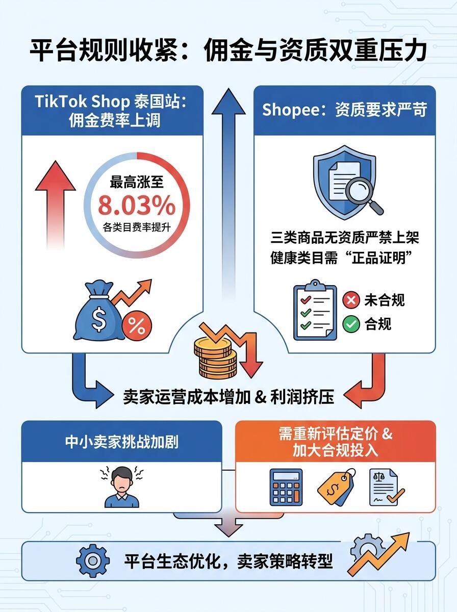 TikTok Shop泰国站宣布上调佣金费率,最高涨至8.03%,Shopee也要求三类商品无资质严禁上架,健康类目商品需提供“正品证明”。这些变化直接增加了卖家的运营成本,尤其是中小卖家可能面临利润挤压。平台通过提高门槛来优化生态,但卖家需重新评估定价策略和合规投入。