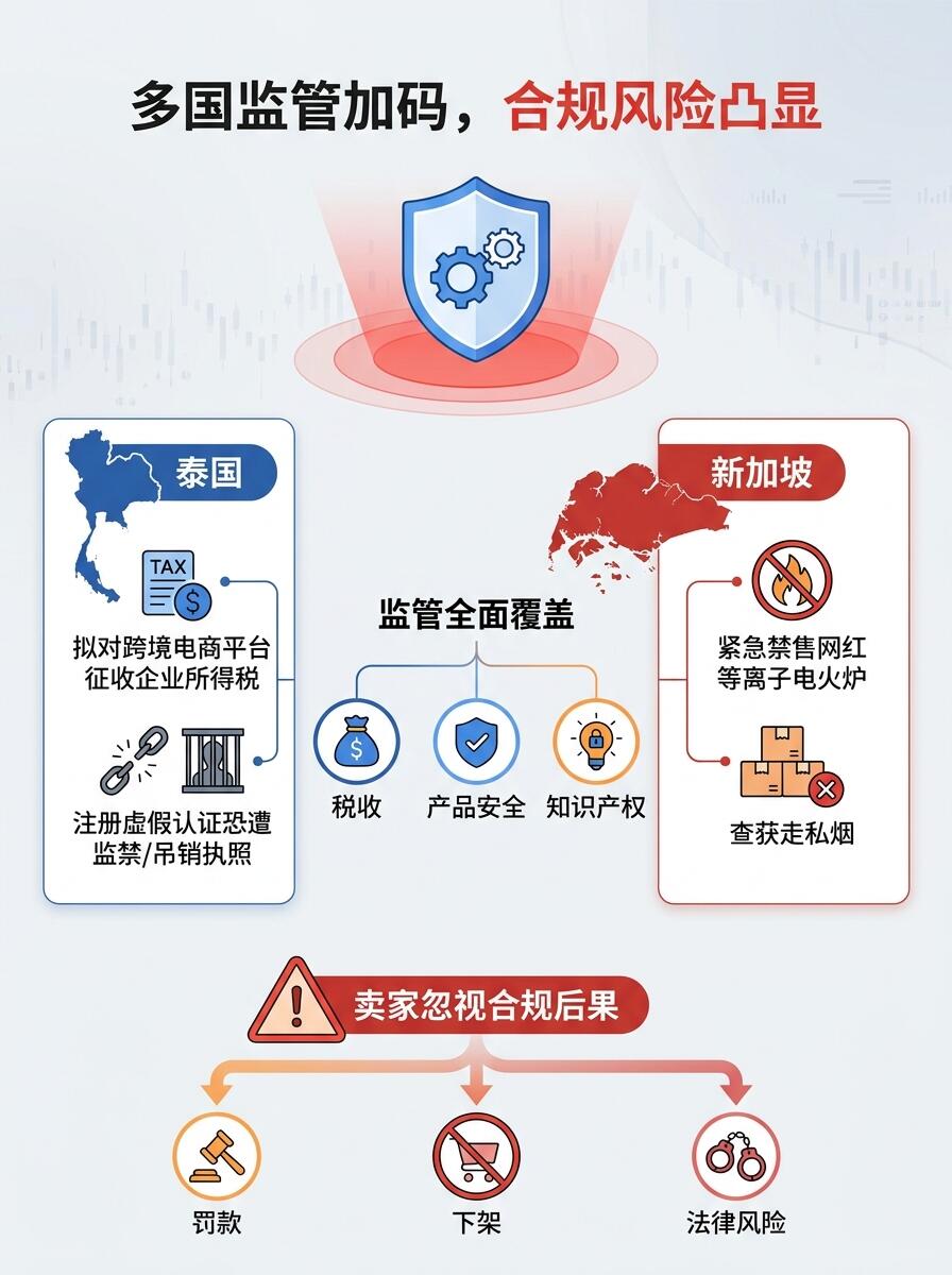 泰国拟对跨境电商平台征收企业所得税,企业注册虚假认证恐遭监禁吊销执照;新加坡紧急禁售网红等离子电火炉,并查获2800万泰铢走私烟。这些政策显示东南亚各国正加强电商监管,从税收、产品安全到知识产权全面覆盖。卖家若忽视合规,可能面临罚款、下架甚至法律风险。