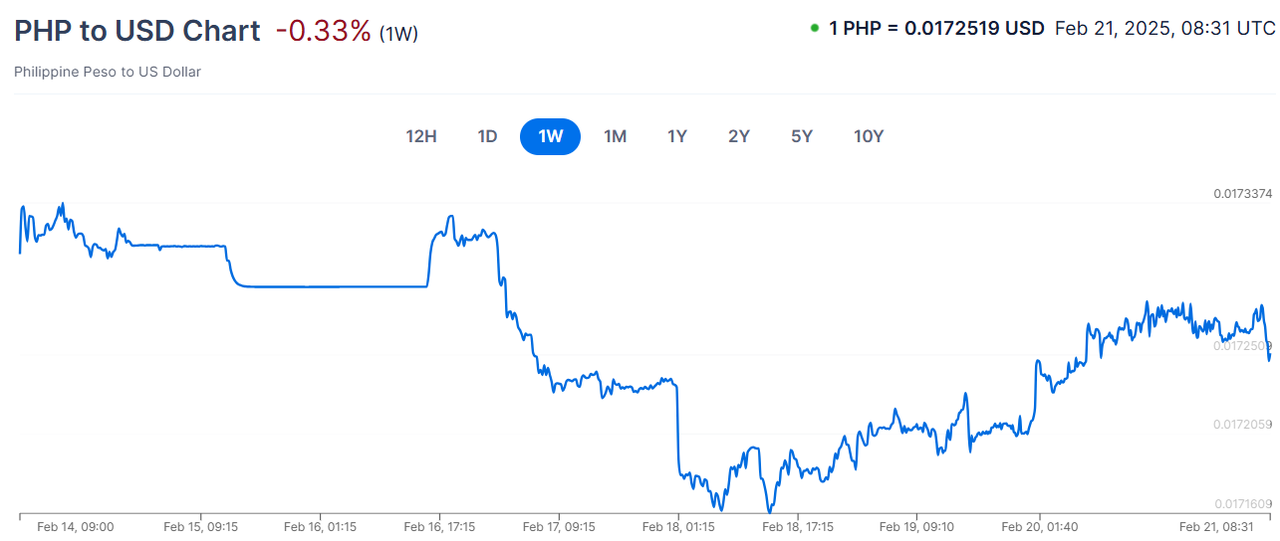 PHPUSD:菲律宾比索兑美元当周延续贬值压力,主要受美国贸易政策冲击及外资撤离影响。马来亚银行预测比索可能在2025年第二季度跌至63 PHP/USD的历史低位,而菲律宾央行虽维持基准利率5.75%并计划降低银行准备金率,但市场信心仍显脆弱。