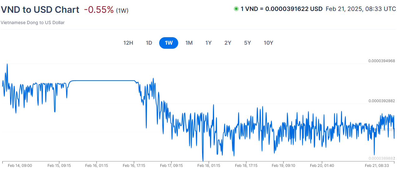 VNDUSD:越南盾兑美元汇率在当周延续贬值趋势,主要受美国加征关税风险及资本外流压力影响。尽管越南央行将参考汇率下调至24,522 VND/USD,但商业银行美元现汇价格一度触及25,777 VND/USD的上限,特朗普政府计划对越南商品加征关税,导致贸易顺差预期收窄,加剧汇率压力。