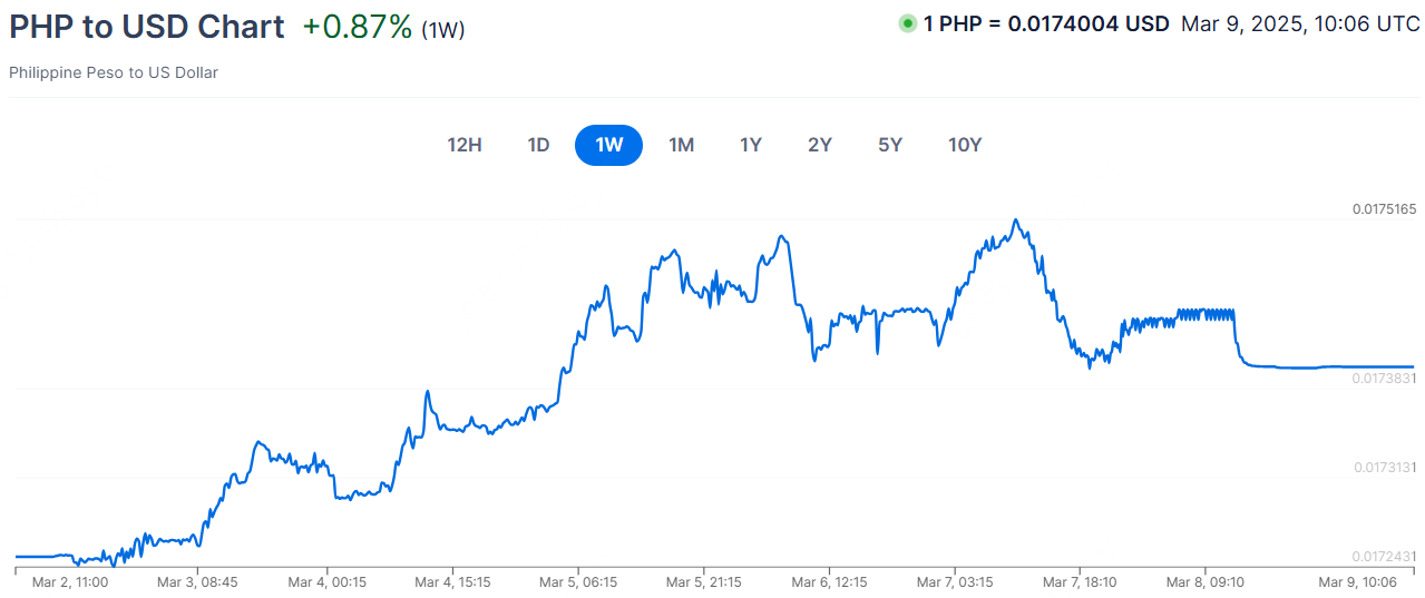 PHPUSD:3月5日,菲律宾比索兑美元汇率升至去年10月以来最高水平,随着美元走弱,在周内保持上涨态势。花旗银行预测鉴于经济增长面临阻力,菲律宾央行今年可能降息三次。