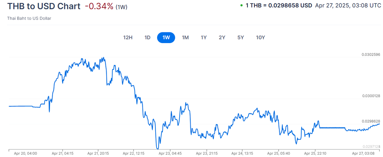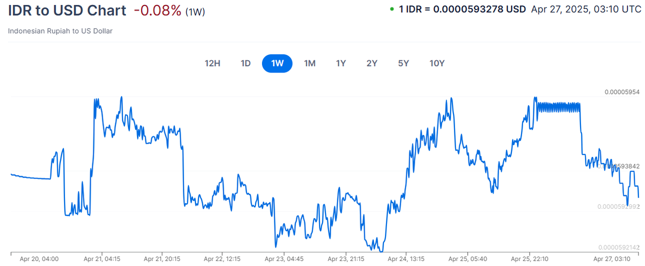 IDRUSD:印尼盾兑美金本周呈现了先跌后涨的态势。本月早些时候印尼盾因美国对印尼等国实施报复性关税而跌至历史低点,虽后因关税冻结而有所回升,但仍对印尼盾汇率产生了较大影响。印尼已派出代表团前往华盛顿就关税问题进行谈判,若美国维持对印尼出口的32%关税,印尼经济增长潜力可能下降0.3至0.5个百分点。同时印尼央行在4月23日维持政策利率不变,以应对全球贸易紧张局势并保持盾币汇率稳定。