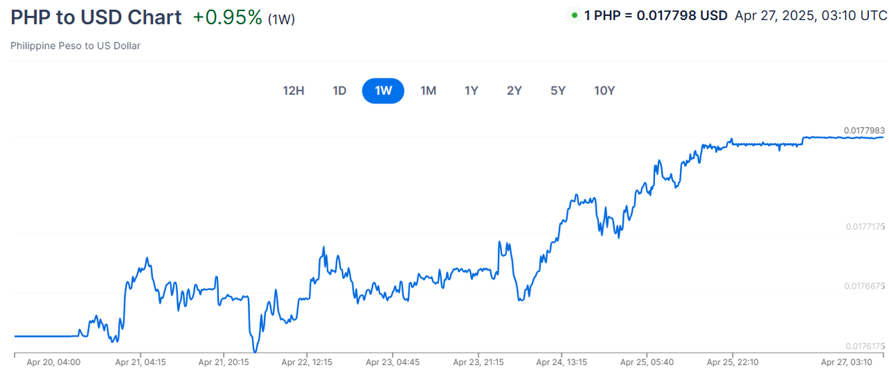 PHPUSD:整体来看,本周菲律宾比索兑美元汇率呈上升趋势,比索升值。菲律宾经济基本面表现稳定是比索近期升值的基础因素。稳定的经济环境增强了市场对菲律宾经济的信心,使得投资者更愿意持有比索,推动比索升值。