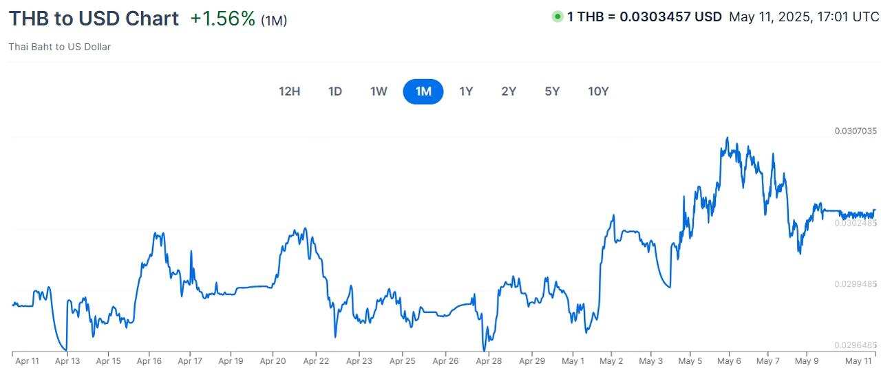 THBUSD:4 月泰铢兑美元汇率呈现波动态势,总体以升值为主。从贸易政策与外交关系看,泰国采取计划增加美国液化天然气采购量,扩大农产品进口配额,降低部分商品关税等措施,一定程度上稳定了市场信心,对泰铢汇率产生积极影响。同时,泰国泼水节迎来不少国际游客,拉动了服务贸易顺差,增加了泰铢的需求,推动泰铢汇率上升。5 月泰铢兑美元汇率走势存在不确定性。若能持续吸引更多外资和游客,泰铢有望保持稳定或升值。