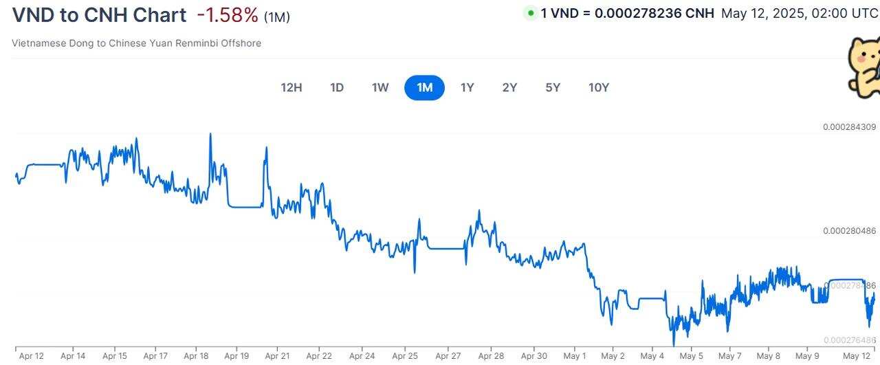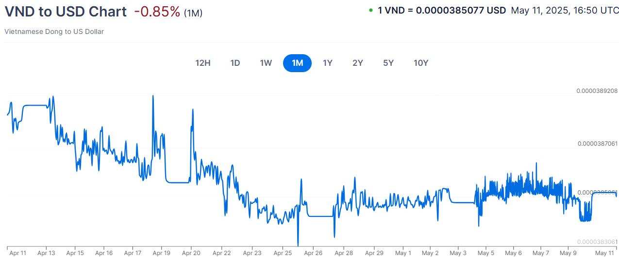 VNDUSD:4月越南盾兑美元呈现贬值态势。美国总统特朗普 4 月 2 日宣布对越南商品加征 46% 的 “对等关税”,这直接冲击了占越南 GDP 近 30% 的对美出口产业,引发市场对越南经济前景的担忧,导致资本外流,推动越南盾贬值。尽管越南一季度 GDP 增速达 6.93%,但制造业 PMI 在 4 月骤降至 45.6,创两年最大跌幅,显示工厂活动显著收缩,也对越南盾汇率造成压力。5 月越南盾兑美元可能继续面临贬值压力。