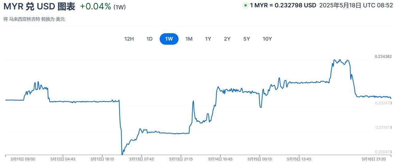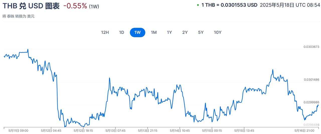 THBUSD:上周泰铢先走弱(美元走强),但受中美贸易谈判乐观情绪影响,亚洲货币(包括泰铢)在周中后有所回升。5月10-11日中美会谈取得“实质性进展”,提振市场风险偏好,带动泰铢等亚洲货币反弹。泰国经济复苏仍较疲软,2025年GDP增长预期仅 2.4%,低于2024年,限制泰铢大幅升值空间。