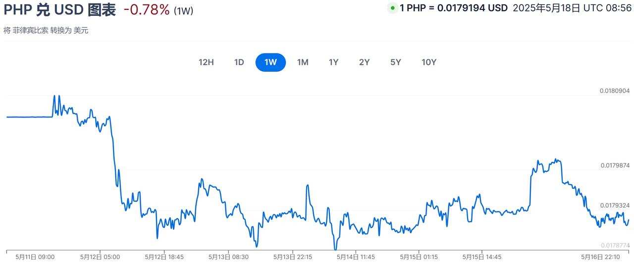 PHPUSD:上周菲律宾兑美金汇率呈现下跌状态。12日中美关税和谈结果超出市场预期,美元和人民币双双走强,东南亚货币普遍承压。菲律宾自身经济在复苏过程中面临一些挑战,如通胀压力、贸易不平衡等问题,这对外汇市场上的比索汇率产生一定的负面影响。