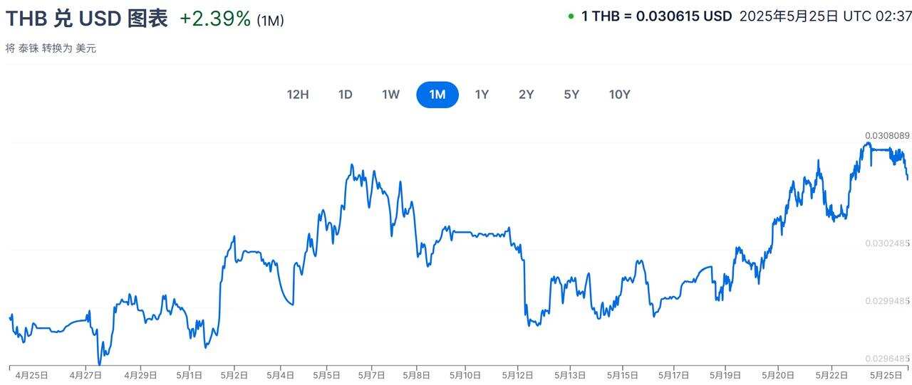 THBUSD:整体来看,上周泰铢兑美金汇率呈上涨态势。泰铢近期的升值主要受外部因素影响,美国经济存在不确定性、财政稳定性受担忧以及穆迪下调信用评级展望等因素,使得美元在国际市场上走弱,这是泰铢兑美元汇率上涨的重要因素。国际金价持续攀升,由于黄金与泰铢存在一定的相关性,投资者为购买黄金需兑换泰铢,从而增加了全球市场对泰铢的需求,推动泰铢升值。