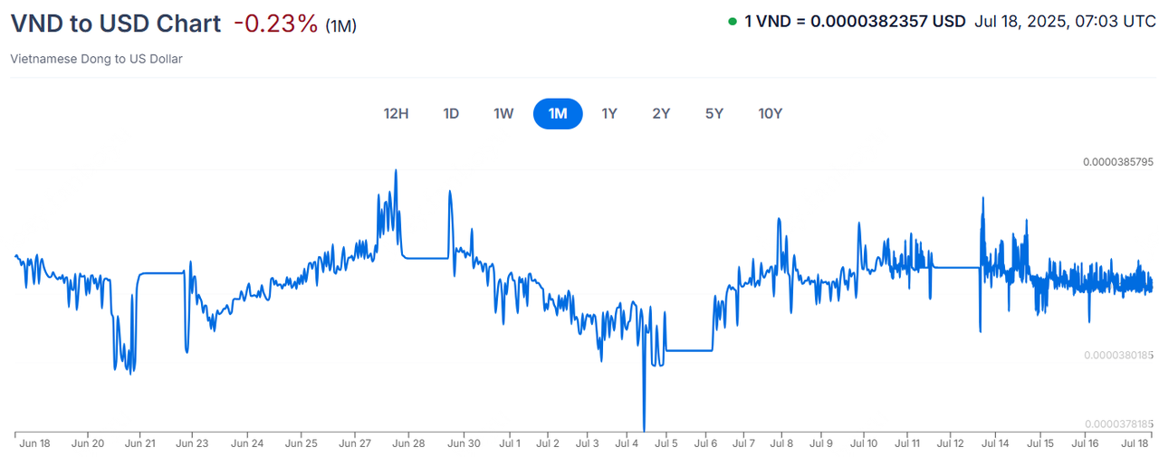 VNDUSD:2025年第二季度越南国内生产总值(GDP)同比增长7.96%,源于得到出口、政府投资和工业扩张的推动,有分析预计,下半年越南经济增速将低于上半年的7.52%;全年将增长6.7%,高于先前预测的5.3%,主要支持因素是越南与美国达成协议,美国对越南商品征收的对等关税从46%降至20%。不过,下半年越南经济料受到越南出口将大幅放缓、越南总体贸易顺差减少银行系统的坏账问题仍然相当严重等因素的拖累,越南盾走势仍将偏弱。