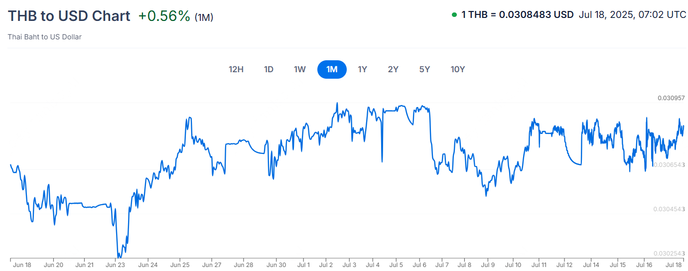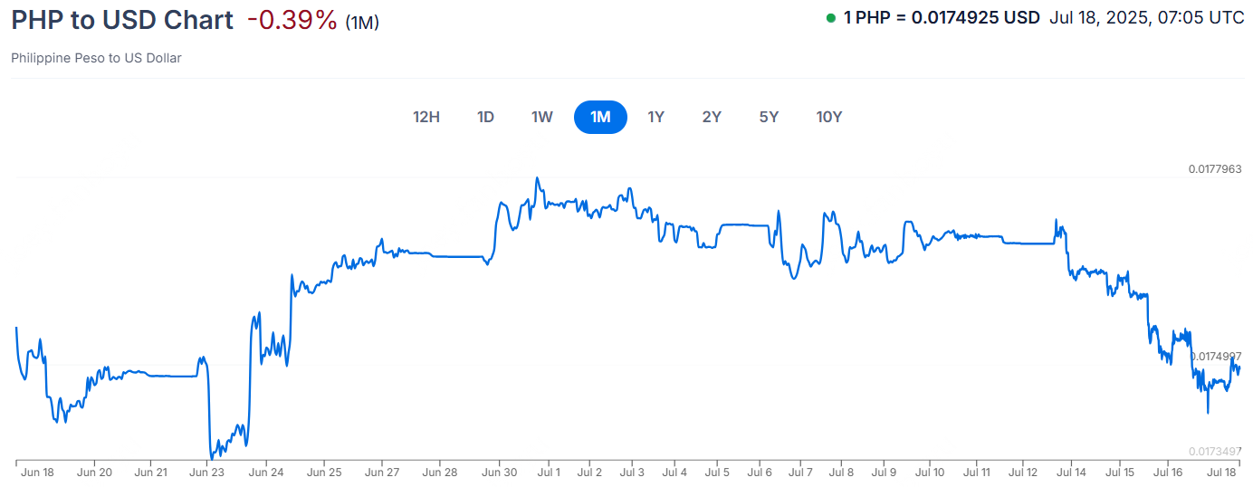 PHPUSD:菲律宾比索在上周整体呈现先抑后扬但整体走弱的态势,全周累计贬值约 0.7%,创 5 月中旬以来的单周最大跌幅。此前美国政府宣布自 8 月 1 日起对菲律宾输美商品加征 20% 关税,市场担忧菲律宾电子、农产品等主要出口行业将面临利润压缩(菲律宾对美出口占其总出口的 18%),导致外资加速撤离。且菲律宾预计将继续降息实行宽松的货币政策,预计短期内比索走势仍将偏弱。