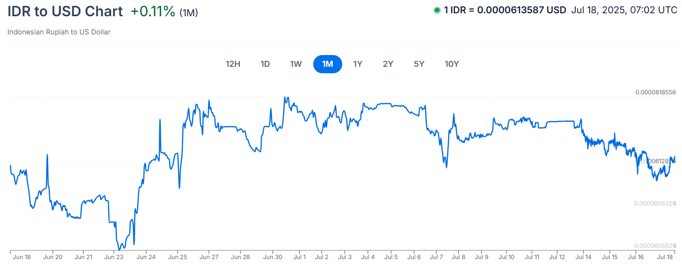 IDRUSD:上周,印尼央行维持基准利率 5.50% 不变,鉴于通胀可控且经济增长面临外部压力,其倾向于在 2025 年下半年采取宽松货币政策,以刺激经济。同时,印尼政府计划自 7 月起实施电子商务税,旨在增加财政收入并规范电商市场纳税。此外,印尼出口受美国 19% 关税冲击。短期内,印尼盾或因美国关税冲击出口、经济增长预期放缓以及下半年可能的降息等因素面临贬值压力。