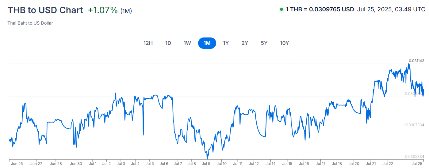 THBUSD:上周受泰柬边境局势突变影响,泰铢汇率出现显著回调,旅游与边境贸易也同步承压。本轮冲突已直接影响泰国资本市场及区域经济信心。此前泰铢受益于中美贸易缓和、外资回流与国际金价走高等多重利好持续走强,但边境冲突升级使投资者选择在泰铢高位获利了结,泰铢从高位跌落。若局势持续紧张,可能中断泰铢的上涨趋势。