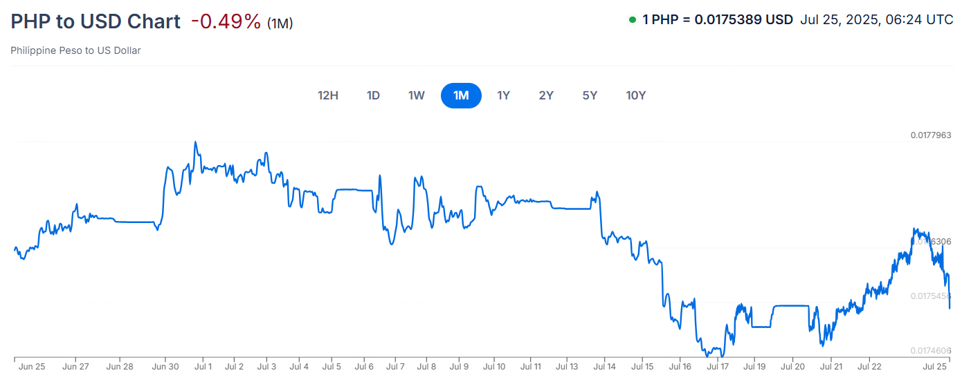 PHPUSD:菲律宾比索兑美元汇率上周呈现先上涨后震荡贬值趋势。从外部因素看,市场对9月降息预期未能抵消美元强势,美元指数全周在 97.1-97.5区间震荡,压制新兴市场货币的表现。菲律宾比索本周预计区间震荡 56.5-58.0比索/美元。若利空叠加,可能下探59.0的预测水平。