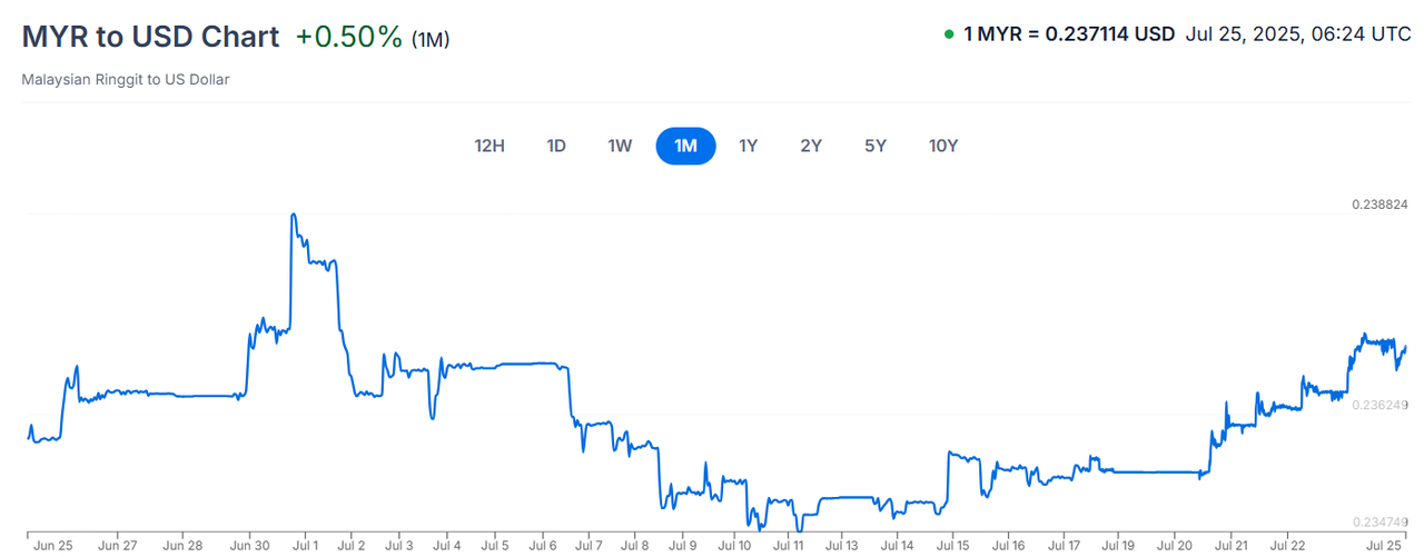 MYRUSD:林吉特兑美元上周整体呈上涨趋势。前段时间马来西亚央行降息消息公布后,林吉特兑美元汇率一度下跌约 0.3%,但跌幅相对温和。综合来看,短期内林吉特仍面临一定贬值压力,但如果美国关税政策未出现大幅恶化,且马来西亚出口数据和外资流入情况良好,林吉特汇率可能会保持相对稳定,甚至有一定的回升空间。