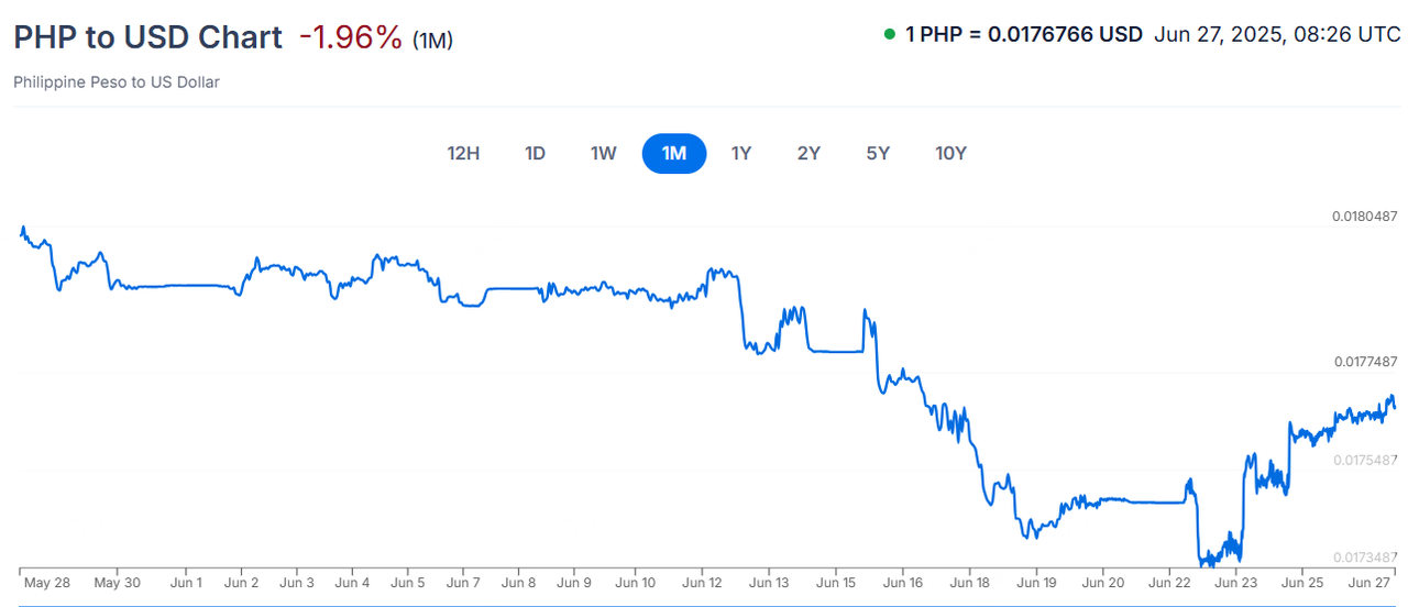 PHPUSD:经济增长方面,一季度进口激增导致菲律宾经济增速意外下滑。货币政策方面,在低通胀环境下,菲律宾央行或将到2025年底将利率从5.25%下调至4.75%。政治方面,菲律宾总统马科斯中期选举失利,与杜特尔特家族的政治斗争白热化,导致菲律宾国内政局持续紧张。汇率方面,菲律宾比索今年或将走弱。