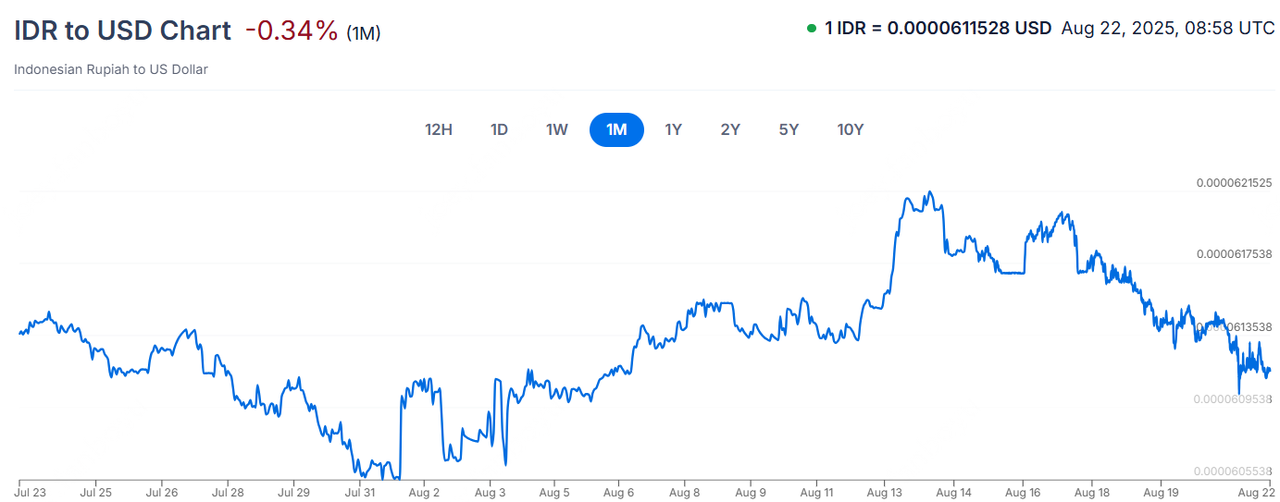 IDRUSD:印尼央行意外将关键利率下调25基点至5%,连续第二个月降息,印尼盾兑美金继续延续跌势。印尼盾年初至今(截至8月6日)已贬值1.6%,成为东南亚表现最弱的货币之一,主因全球波动和国内政策不确定性、美国政策变化导致的全球扰动、以及外国机构投资者的持续抛售。