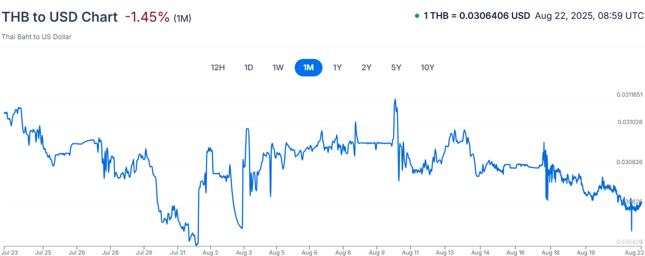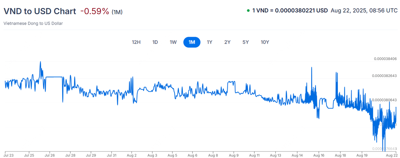 VNDUSD:8月21日,美金兑越南盾跌至26436,越南盾创盘中历史新低。这一显著贬值使得越南盾进一步承压,年初至今,越南盾兑美元已累计贬值约5.6%,凸显了越南经济面临的外部压力。越南国内经济增长面临挑战,通胀压力与贸易逆差持续扩大,进一步削弱了投资者对越南盾的信心。特别是在全球贸易环境不稳定的背景下,越南作为出口导向型经济体,其出口增速放缓,加剧了外汇市场对越南盾的抛售压力。