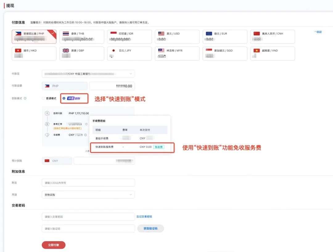提现时选择“快速到账”模式不额外收取其他费用(示意图)